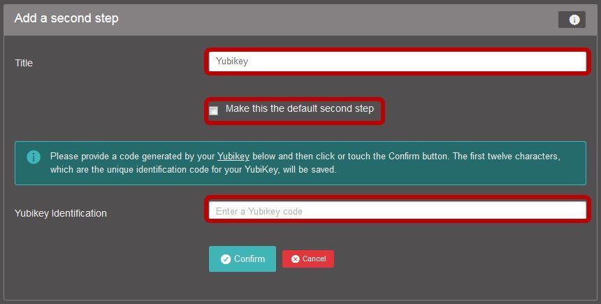 You can set up the Two-Factor Authentication (2FA) to use YubiKey, a hardware secure token, this means that at every login you will receive a code on your YubiKey and be prompted to enter it in order to login to your cockpit. You can learn more about YubiKey on their website here .